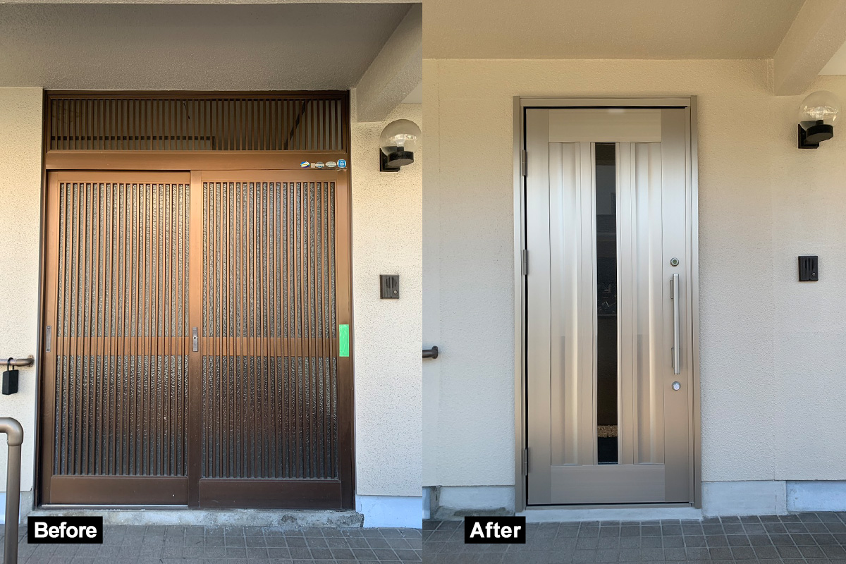 引き違い戸だった玄関をシルバーの片開きドアにすることで、スタイリッシュでモダンな雰囲気に。