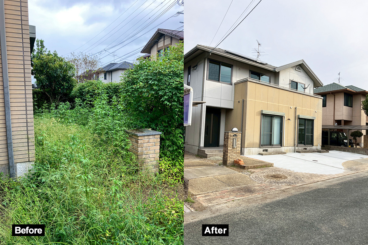 外部は草や樹木がすごいことになっておりましたが、全て伐採してコンクリートで駐車場を拡張しました!