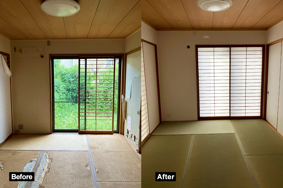 以前動物を飼ってらっしゃったようで和室もボロボロでしたが襖張り替えや畳新調で綺麗にしております!
