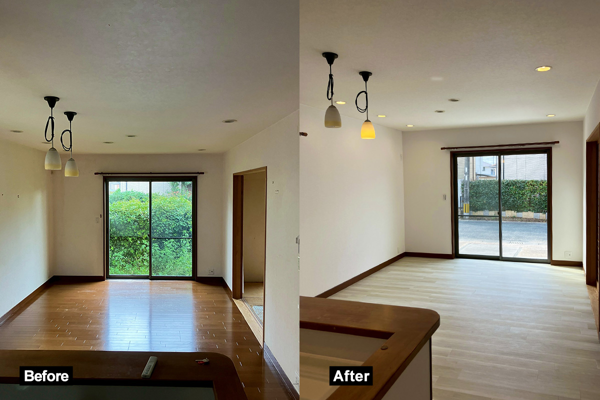 キッチンに続くリビングダイニングもフローリングを張り替えることで部屋が明るい雰囲気に!